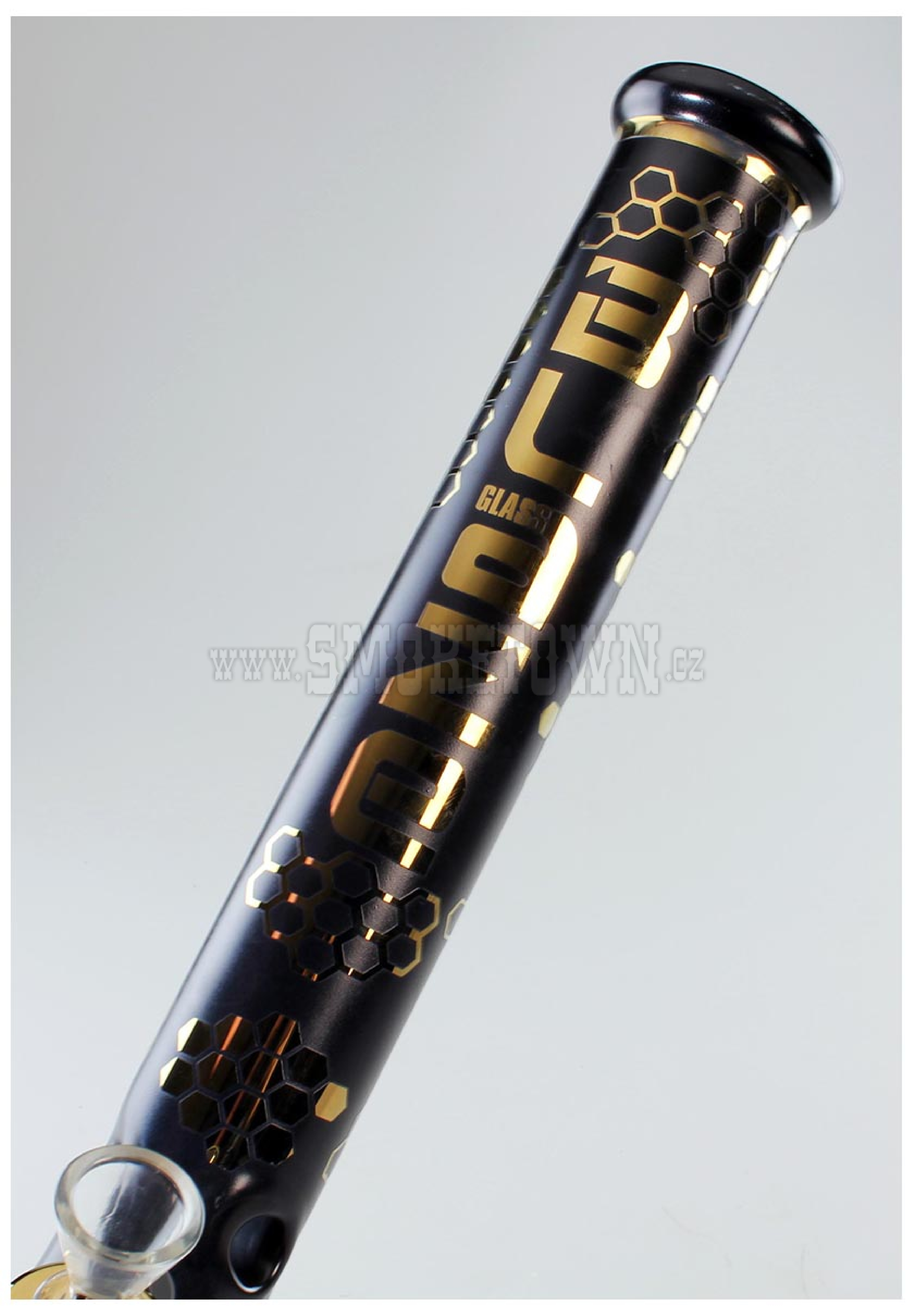 Borosilikátové sklo s matným antracitovým nástřikem v kombinaci s elegantním galvanickým zlacením dodává pístovému bongu BLAZE velmi luxusní vzhled.