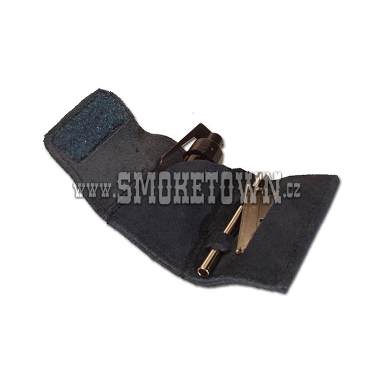 Sada dávkovacího podavače malého frkače/čichadla s žiletkou s rukojetí pro porcování, kovovou trubičkou a malou lahvičkou se dodává v látkovém sáčku se suchým zipem.